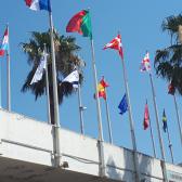 sous la passerelle aux drapeaux, dernière la Poste.